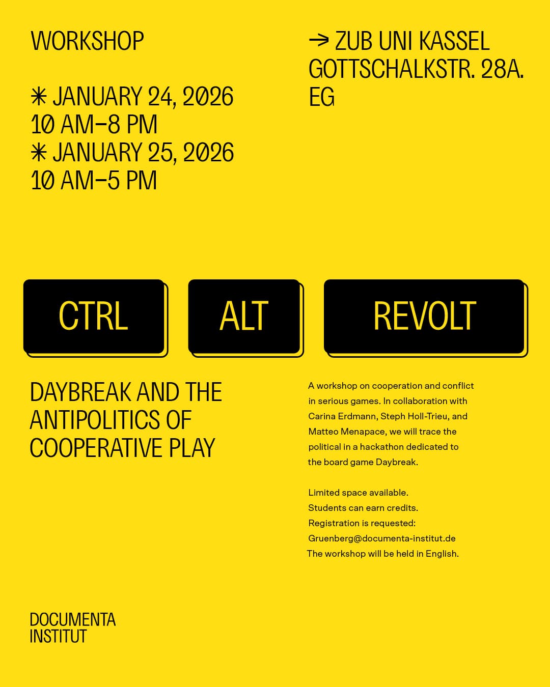 Da die Plätze begrenzt sind, ist eine Anmeldung erforderlich: gruenberg@documenta-institut.de